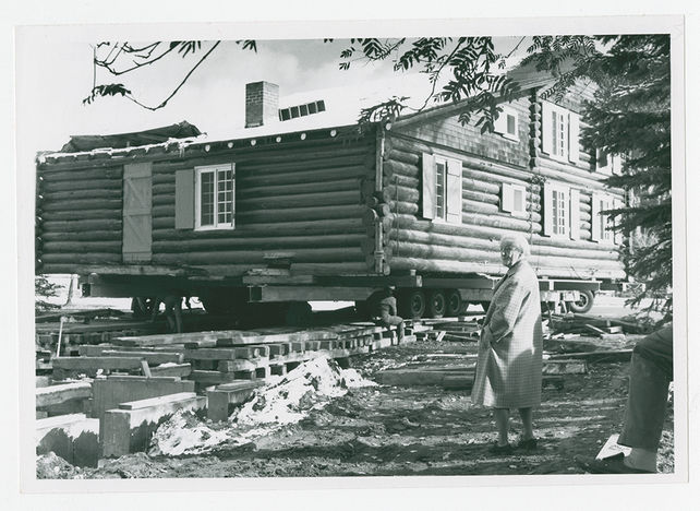 Pearl Moore watching the moving of the Moore house from Banff Avenue to site next to Archives.